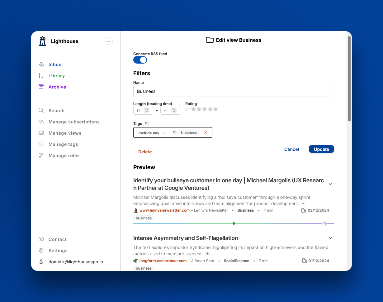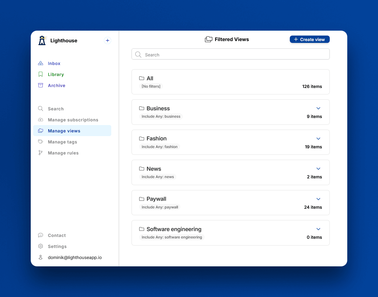 The inbox lets you curate content, so that only the content you find interesting lands in the library. And with views you can organize your library even further. They're basically a filter on the content in your library, so that you see only what you currently want to.