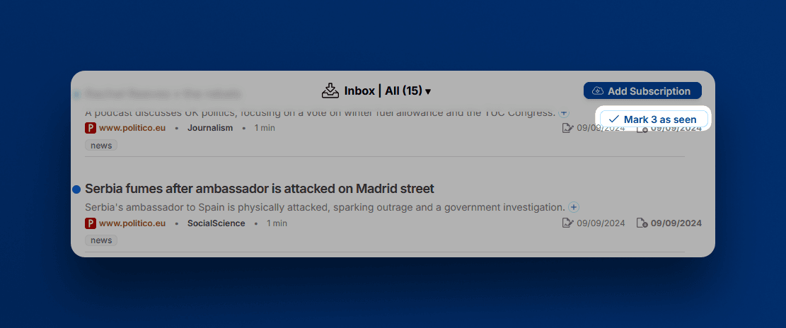 In the inbox, the Mark as seen button now shows how many items will be moved to the archive.