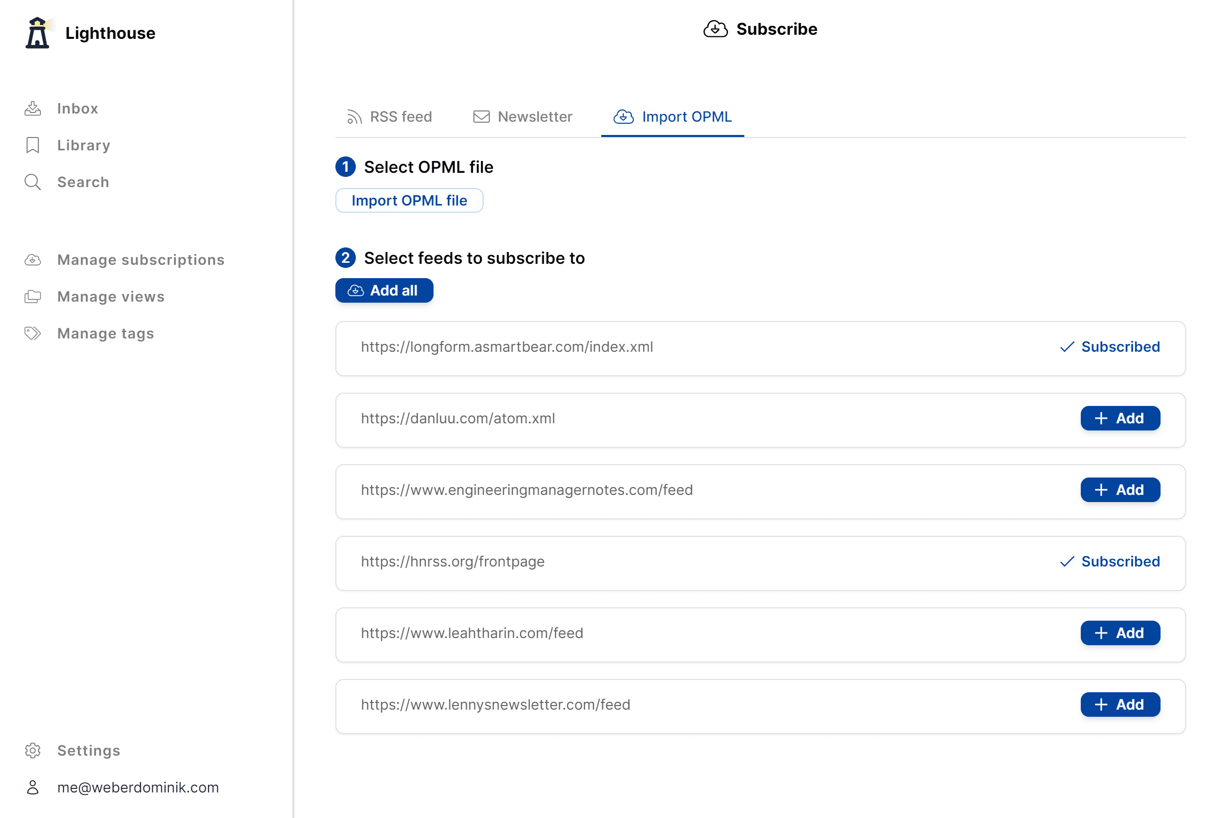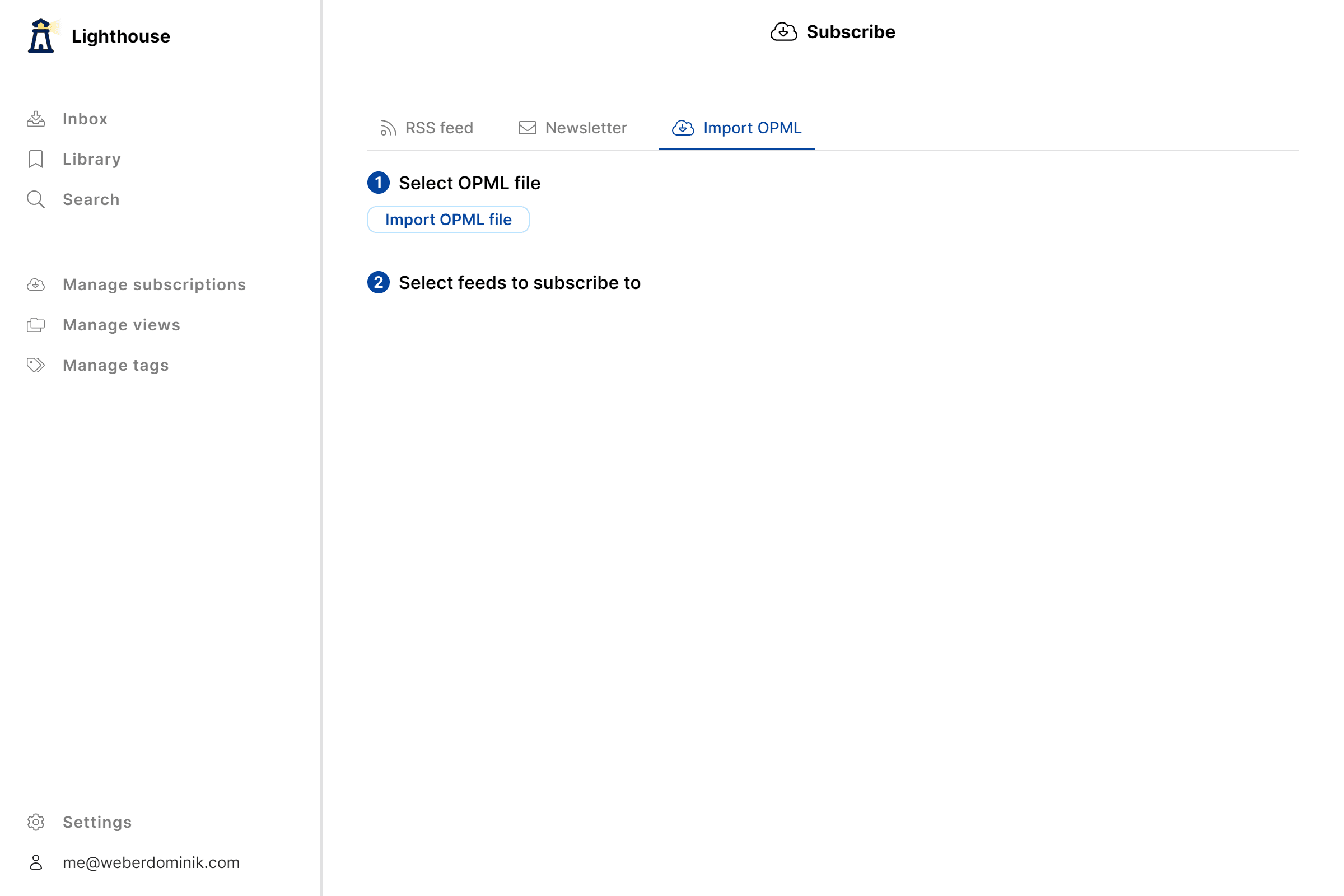 With Lighthouse, you can import these OPML files and subscribe to all the RSS feeds they contain in one go. This makes the transition to Lighthouse almost effortless.