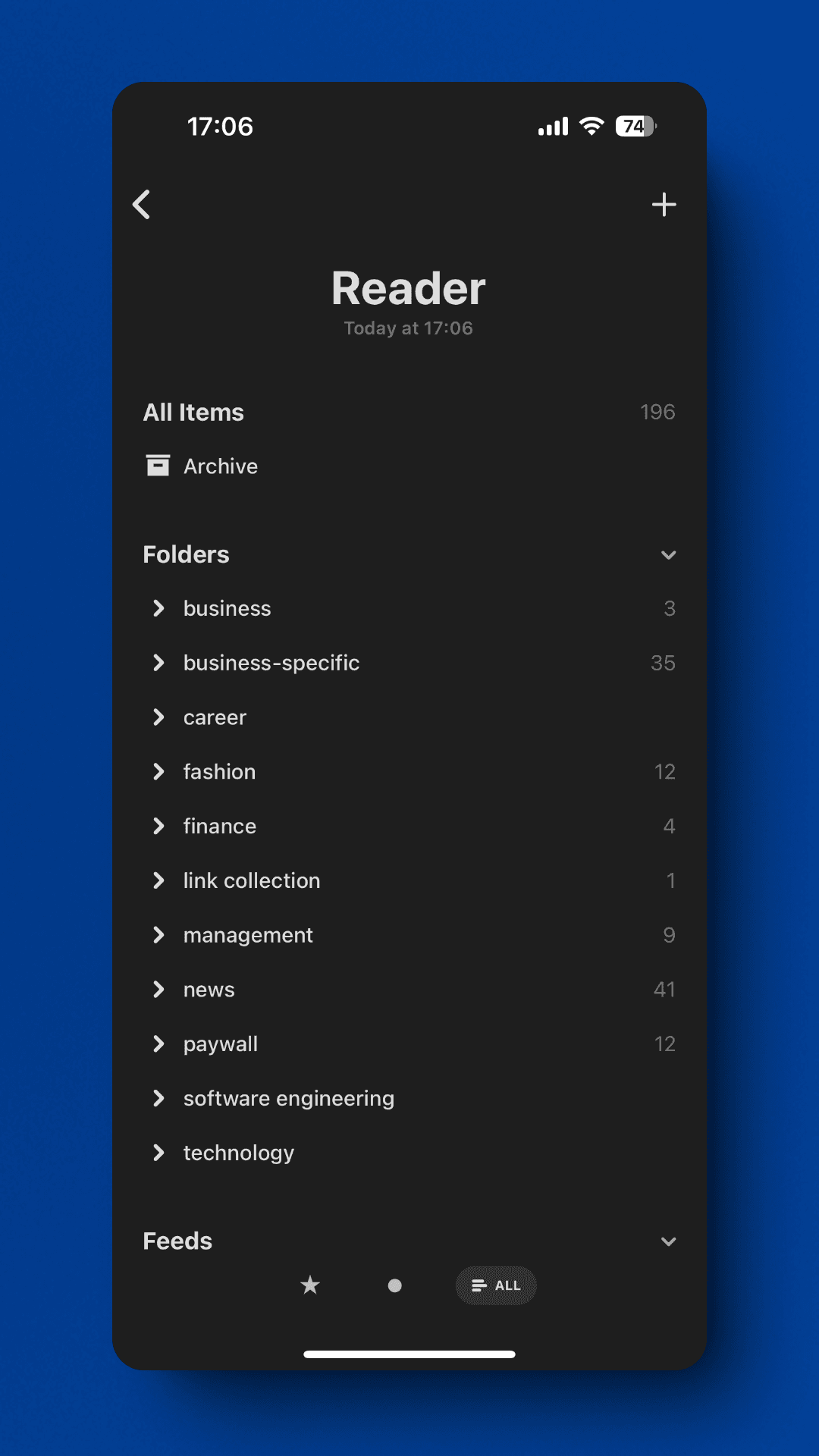After you entered your credentials and signed in, Reeder will sync with Lighthouse to get your feeds and content. This takes a couple seconds, and then you have all your content available in Reeder (or the app you use).