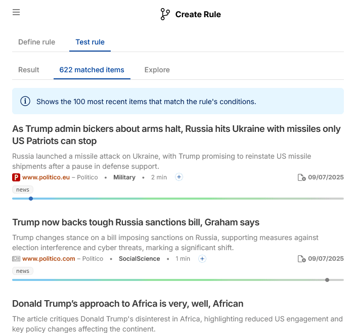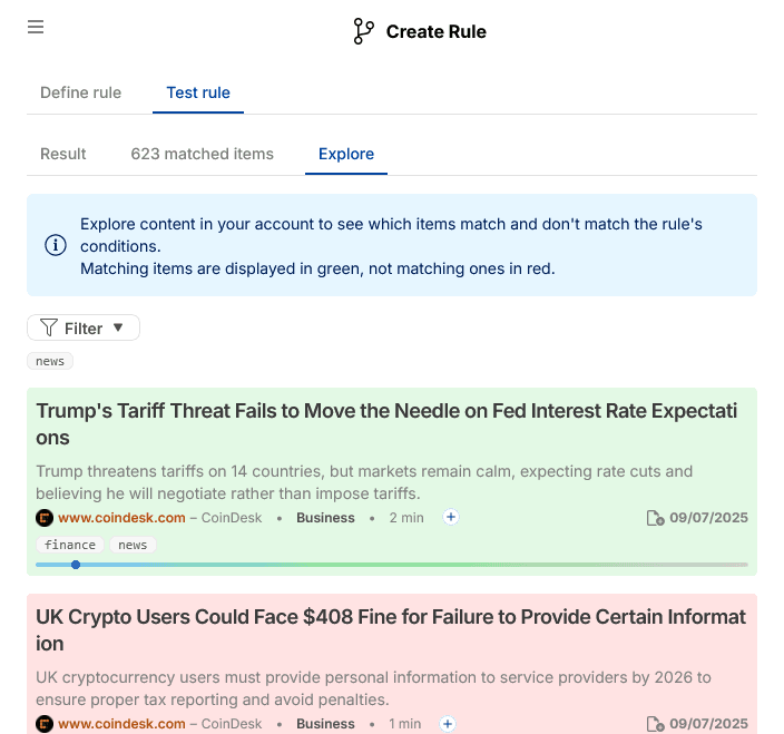 It's also possible to add filters in the Explore tab to only show a subset of items. In this case for example I filtered by the tag news, which makes it easier for me to find items the rule will apply to. And that helps a lot with creating rules that match the items the rule is intended to match.