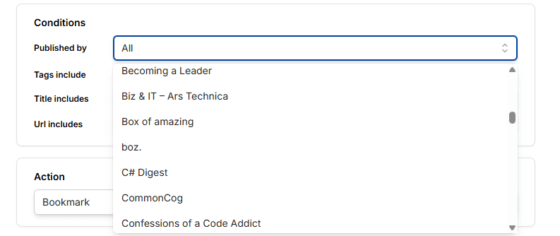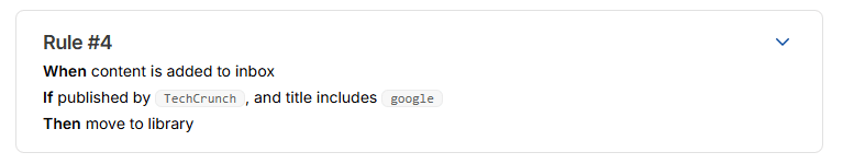 For example, here I created a rule that automatically bookmarks all articles that TechCrunch posts about Google.