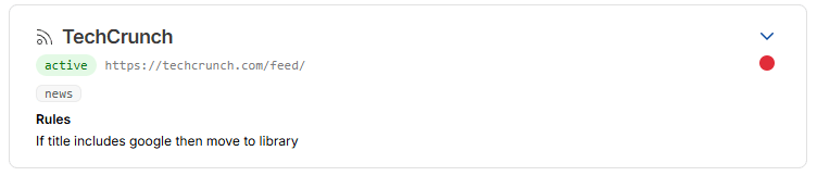 The example rule from before is also visible on the TechCrunch subscription. Here it tells me that all items are automatically moved to the library if the title includes google.