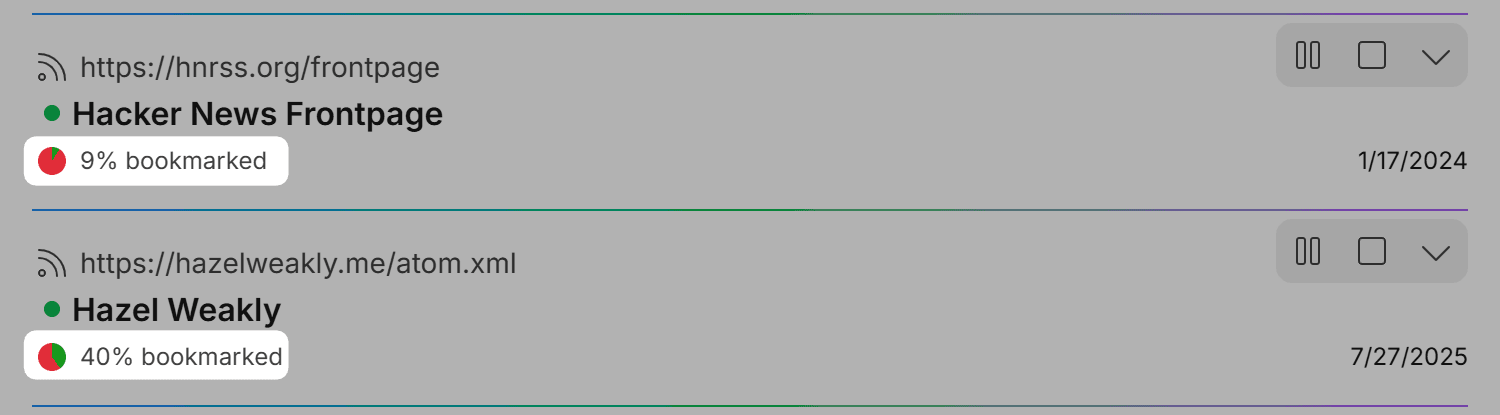 The ratio of bookmarked vs dismissed content from a source. Sorting by that ratio helps finding low-value sources.