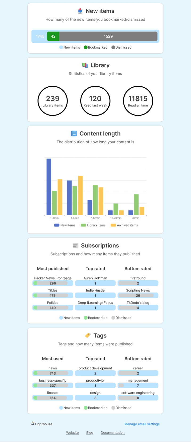 One email every Monday with statistics about content and sources.